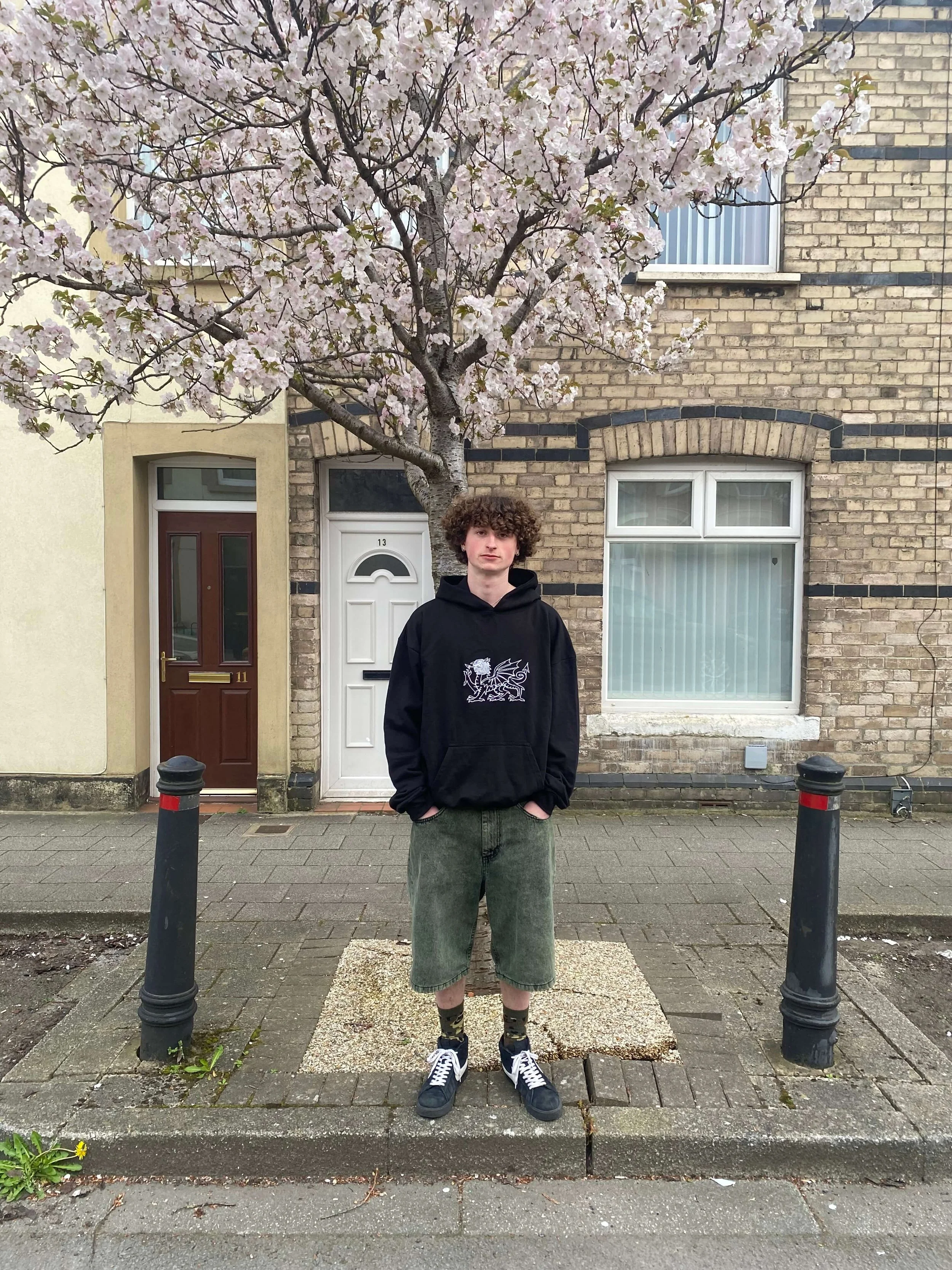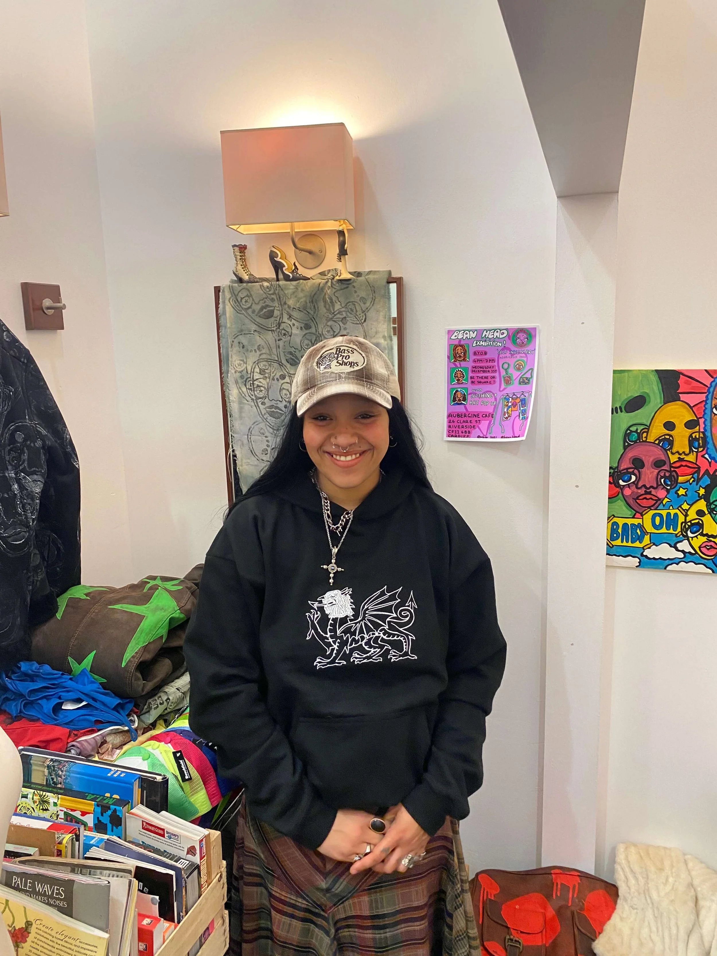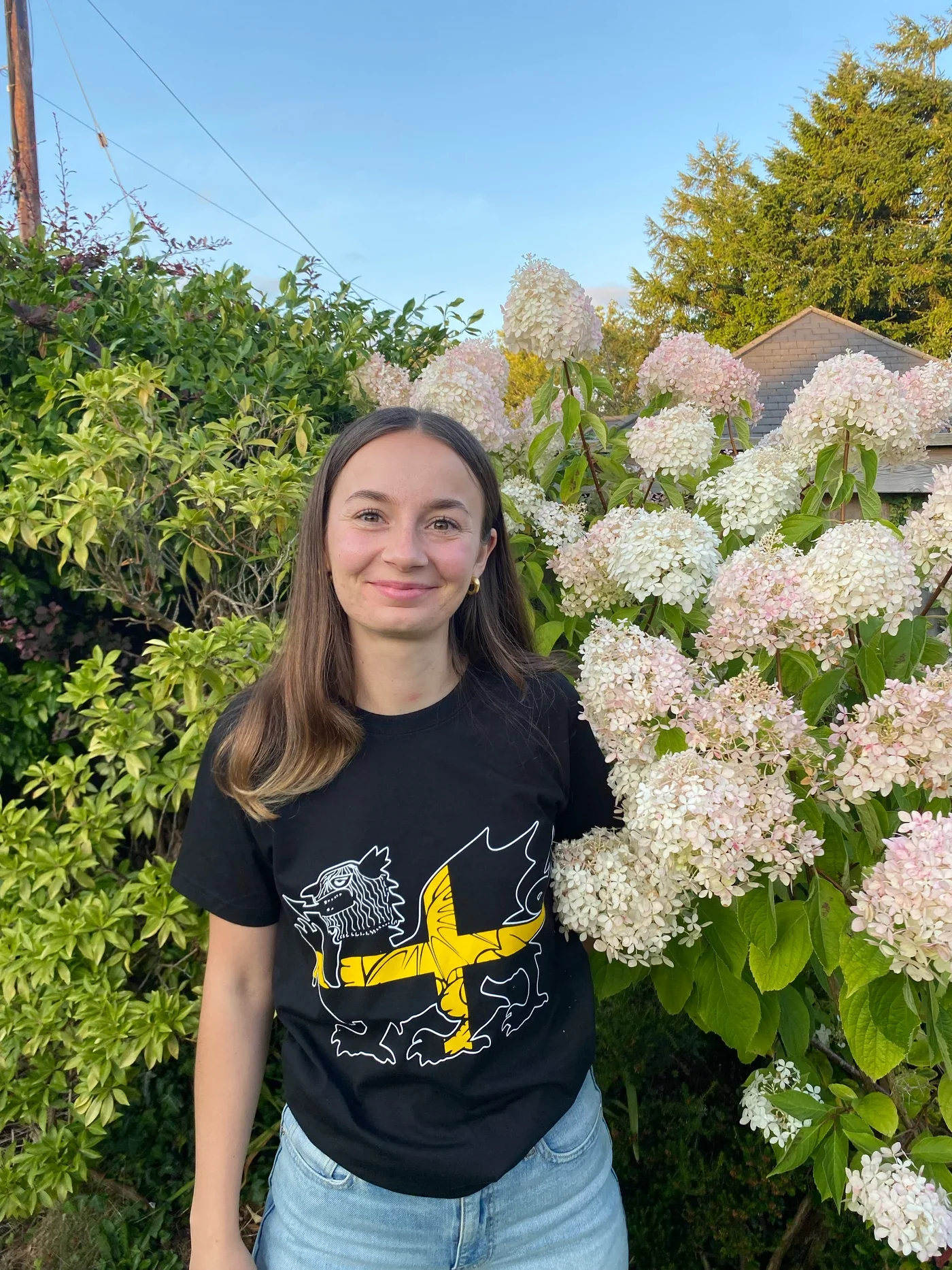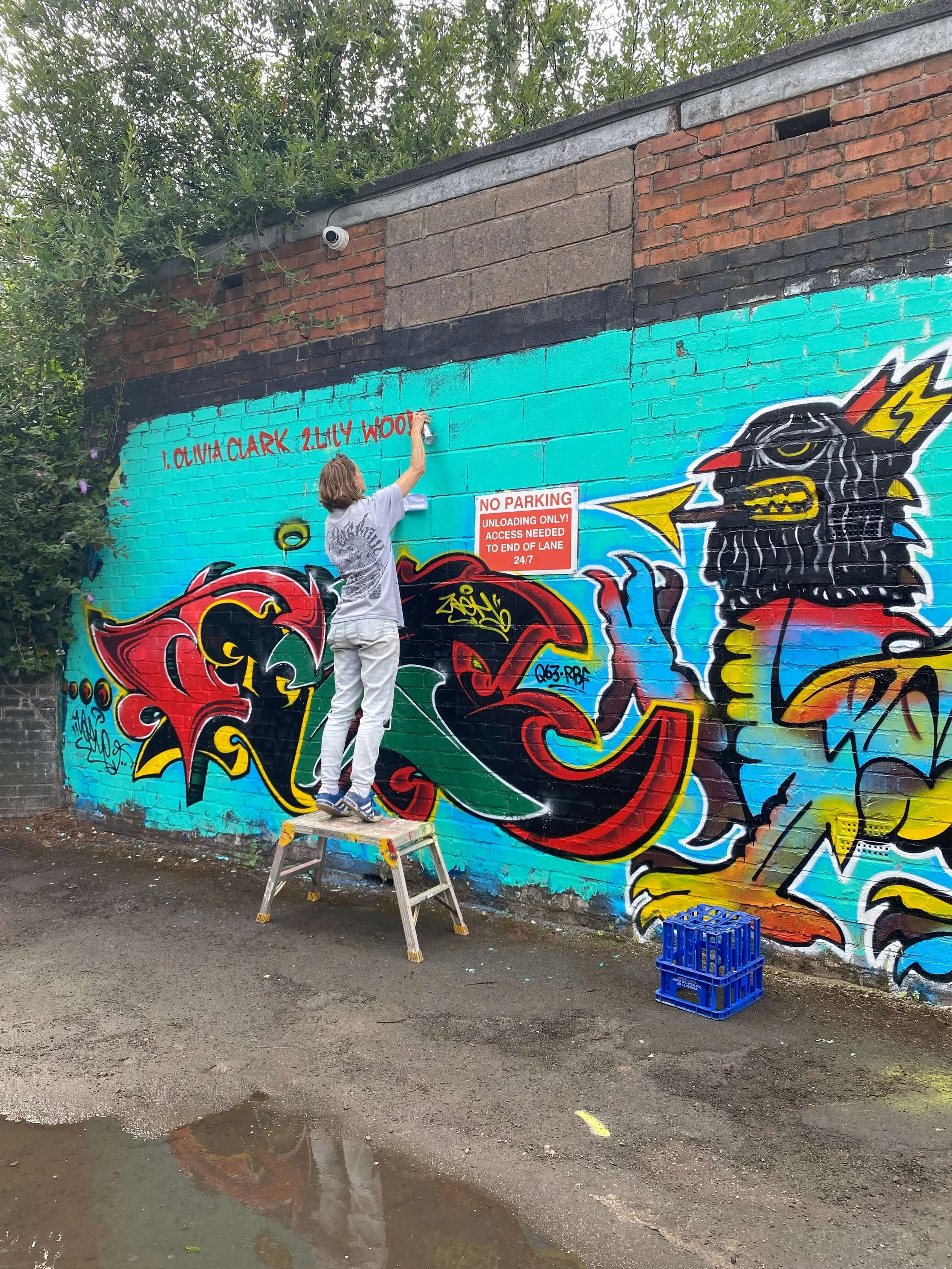 female graffiti artist Unity from Wales painting a wall for the Welsh women football team featuring vozie and revealist dragon in a balaclava