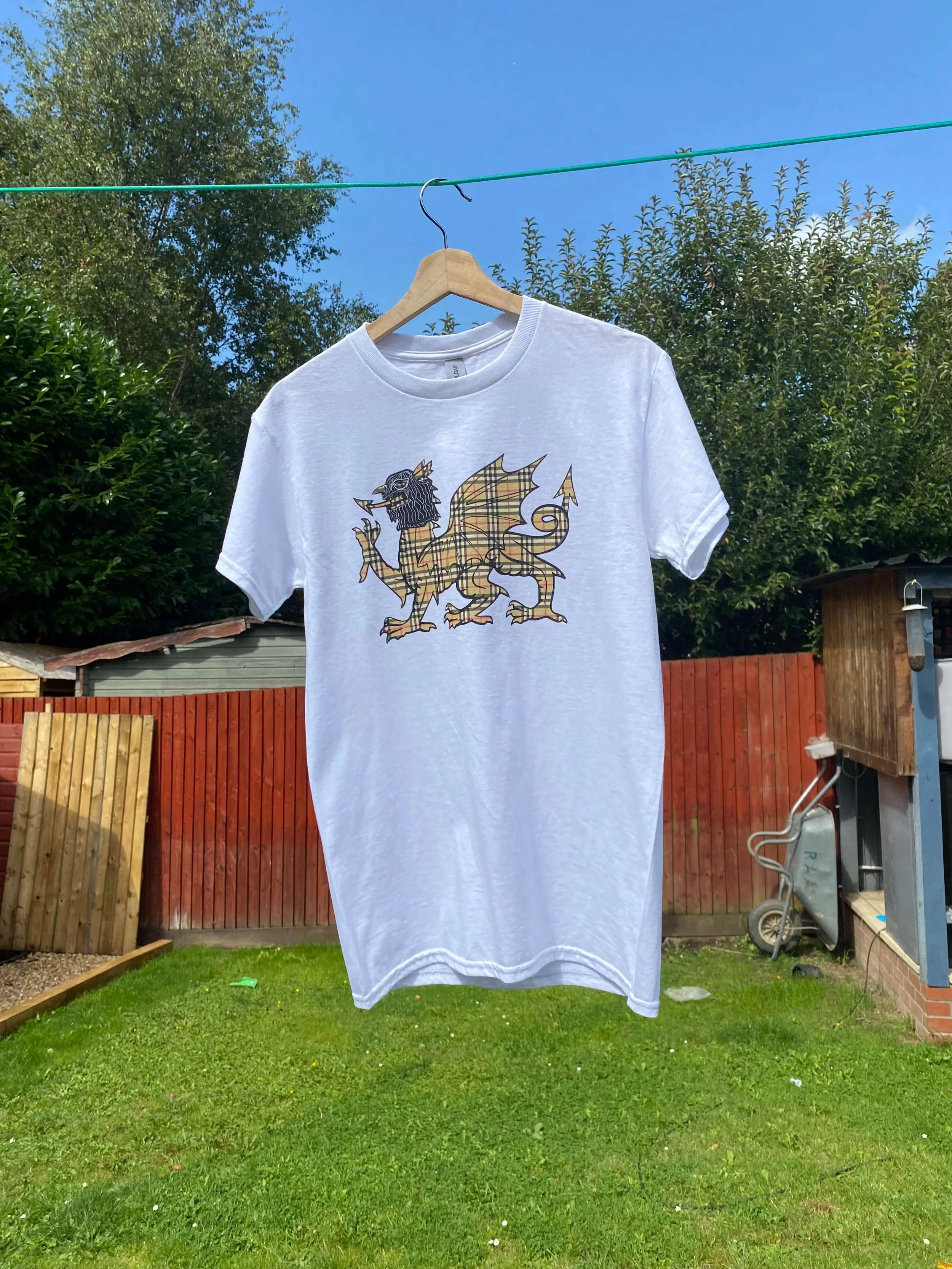 white t-shirt featuring revealist dragon in a balaclava Burberry style print
