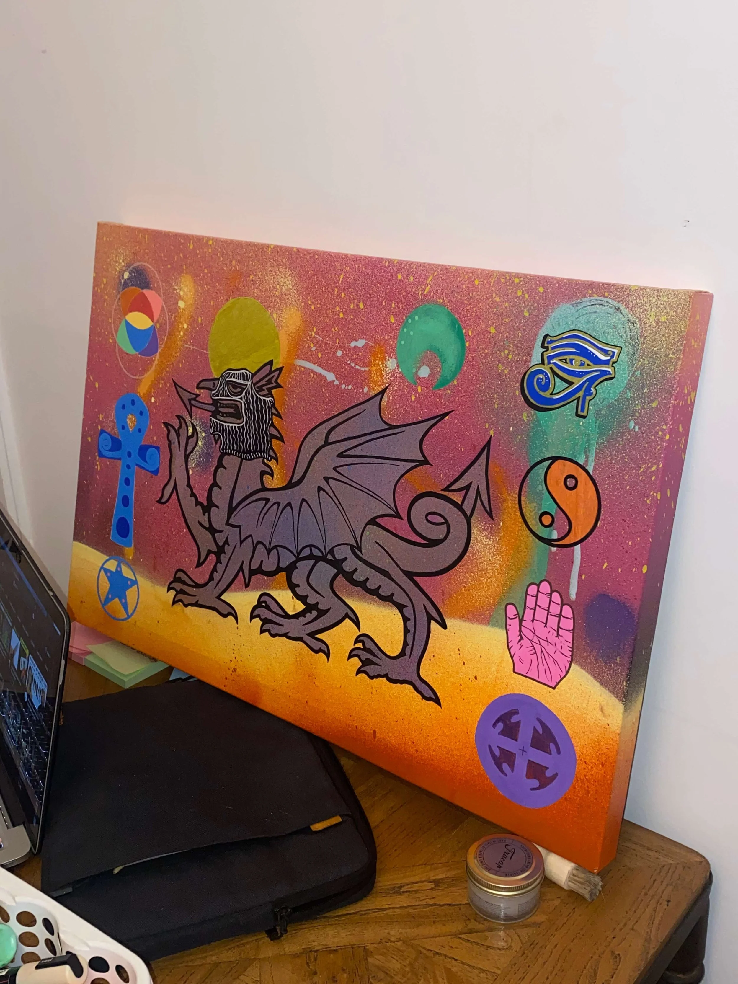 spiritual symbol art canvas dragon in a balaclava rebel dragon sci fi fantasy artwork post spray paint